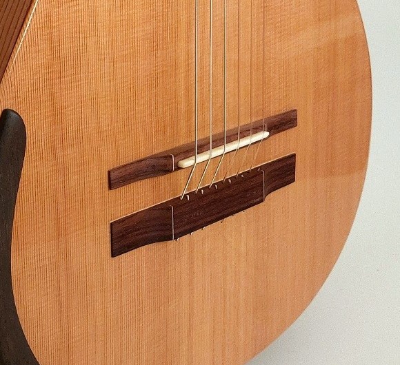 The double bridge design more effectively transmits string vibration to the soundboard with two points of contact established between the strings and the top. The proximity of the floating bridge to the fixed bridge increses the angle of the strings and provides more downward pressure to the soundboard so that more string energy is transmitted to the top. The design also enables precise adjustments to string intonation.