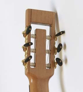 The open headstock design is not only an interesting visual design element but also increases the transmission of strings vibrations from the tuning machines through the neck and to the bodies of the guitars. This feature also contributes to the power and responsiveness of the Caro Topete guitars.