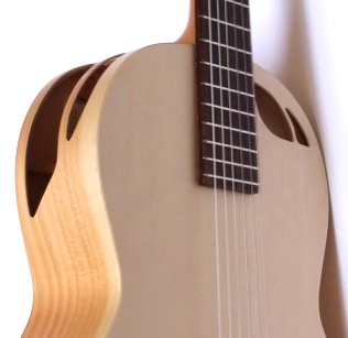 The traditional sound hole is eliminated and replaced by smaller sound holes on the shoulder and acoustic ports on the side. The redesigned soundboard has a larger mass that vibrates with greater amplitude, delivering more volume and a balanced tone.